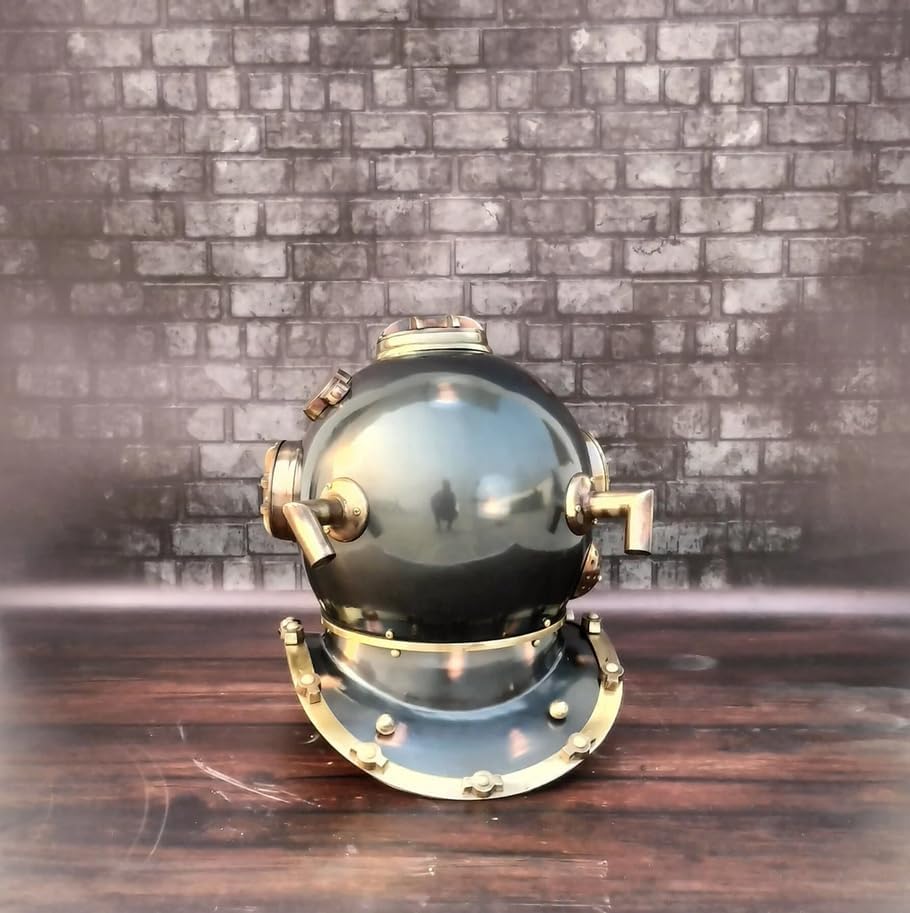 Premium Quality Well Made Deep Scuba Divers Helmet Material Used in the making of this helmet are Steel, Glass And Aluminum Size: 18" Inch Full Size Top head measurements: 16" x 12.5" x 17" / 40 cm x 32 cm x 42 cm Weight: Approx. 6.0 kg. Volume Weight: 12 Kgs approx. Finish: Golden Finish as shown in pict Diving helmets are a great addition to your helmet collection. Note: We will provide only helmet, wooden base is not include in this sale. Beautiful handcrafted for gift on Birthday ,Anniversary, Thanksgiving, Christmas. Can be used as a Home Decorative, Desktop Decorative. Table Decorative Collectible Items It’s Packing is in Single Parcels with Corrugated Export Packing Home or Office and Beach Décor