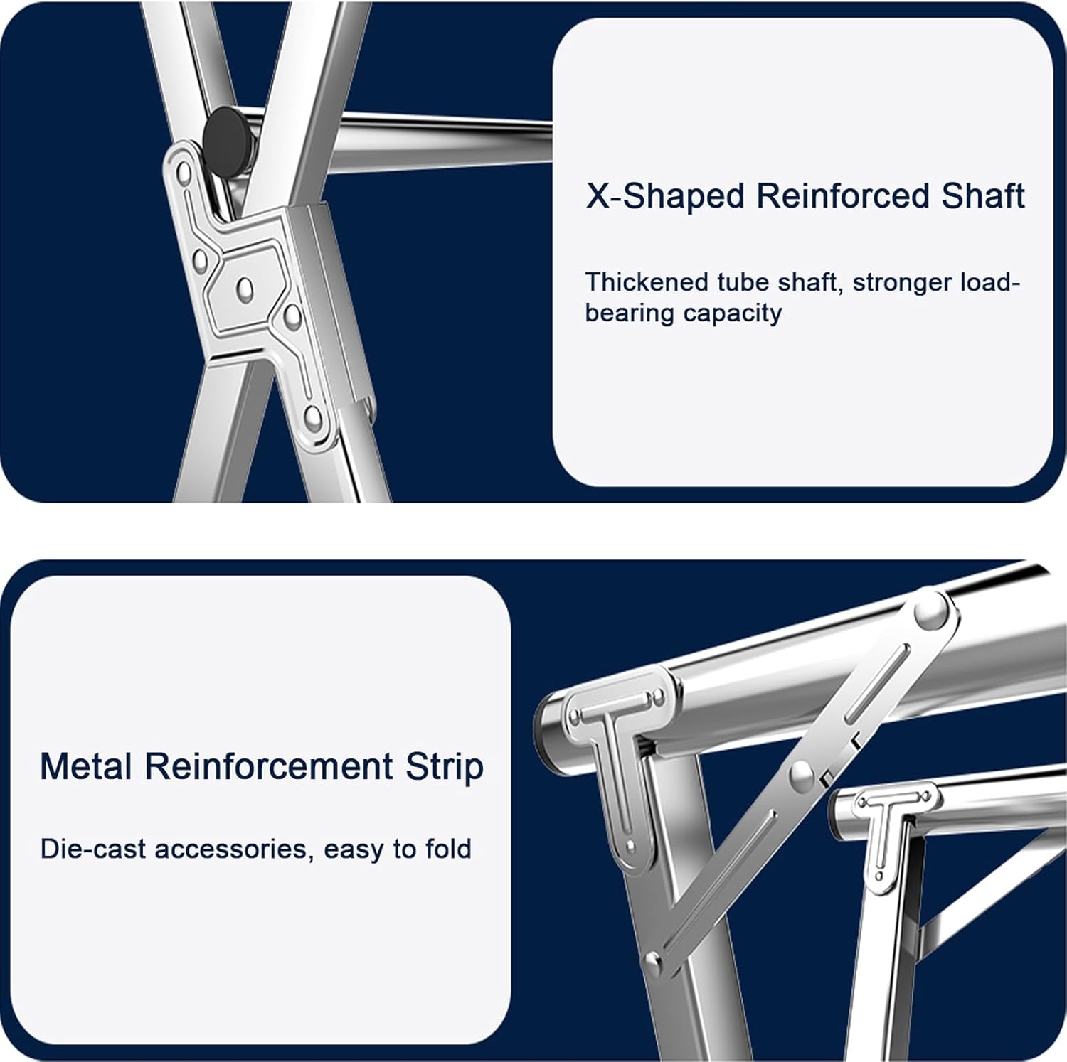 Our collapsible clothes rail is the perfect solution for drying clothes, sheets, towels, and more. Designed to keep your garments wrinkle-free, this space-saving drying rack transforms your laundry routine while keeping your home neat and tidy. Why choose our laundry drying rack? - **Adjustable Length**: Adaptable to any space, whether you have a large laundry room or a compact apartment. - **Easy Mobility**: Equipped with four universal wheels for effortless movement, complete with a safety lock to secure it in place. - **Sturdy Construction**: Made from X-type stainless steel, this clothes drying rack boasts exceptional durability and a strong carrying capacity. - **Convenient Design**: Unfolds easily for use and folds flat for storage, ensuring it won't clutter your living space when not in use. - **User-Friendly Assembly**: Pre-assembled for your convenience, simply unfold it for immediate use, making it accessible for anyone, including women and the elderly. Package Includes: 1 Clothes Drying Rack Optimize your laundry experience and enjoy the convenience of our versatile drying rack, designed to fit seamlessly into your lifestyle and enhance your home.