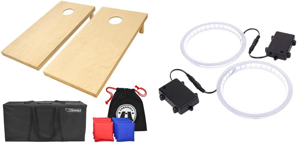 The GoSports Wooden Cornhole sets is built using all wood materials to provide the ultimate Cornhole experience. Plus this set includes our light-up rings which are each powered by 36 bright LEDs - that's 4 times more than the competition so you can play in complete darkness! The games are handcrafted from 100% wood as they do not include any composite materials or plastics. The 4' x 2' size is made to ACA regulations. The top surface is 1/2" varnished cabinet-grade plywood (ACA regulation), that provides the perfect amount of slide. Additionally, the included LED rings can be quickly snapped in and out of your set unlike competitors which must be permanently screwed into your boards, possibly causing damage. The LEDs are powered by 3 AA batteries (included) which last for 24+ hours. The boards are made using handcrafted pine wood frames, featuring mitered corner joints which are far superior to the shoddy construction of the 'homemade style' sets that simply have 2x4s sloppily nailed together. The wooden legs are retractable and are held in place by robust 3/8" galvanized steel bolts with wing nuts. One of the greatest features of the GoSports set is we were able to engineer the weight of each set down to a manageable 38 pounds without sacrificing gameplay. Compare that to the traditional 'homemade style' sets that weigh in at a backbreaking 60+ pounds! This weight savings means you will actually want to bring your Cornhole game with you where ever you go. While the games come with a traditional varnished wood surface, they can easily be painted or customized with NFL or NCAA decals. Also included are 8 regulation size all-weather Cornhole Bags which measure 6" x 6" and weigh 1 pound each. These bags are filled with recycled plastic pellets, so unlike corn, they will not rot if they get wet. Overall this is a well built Cornhole set for Cornhole purists and anyone who loves the fun of classic lawn games!