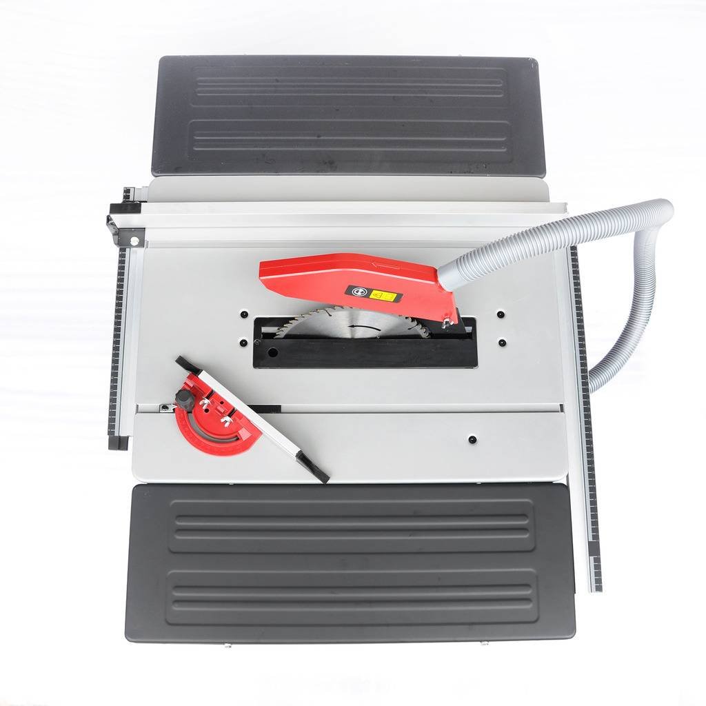 This table saw ipowerful machine with an upgraded 1800w motor that can make exact longitudinal cuts and angle cuts in solid wood, fibreboard and many other materials. The height and angle of the blade can be adjusted individually using the 2-in-1 saw blade adjustment. The powder-coated table width extension and the length stop rail allow particularly wide work pieces to be sawn easilproficiently. Features: 1. 2-in-1 saw blade adjustment (height, anglDegree- 45 Degree). 2. Table width extension for wide work pieces. 3. Saw blade guard with chip extractor connection. 4. Parallel stop with eccentric clamp. 5. Cross stop with angle scale (+/- 60 Degree). 6. Housing with chip extractor connection foclean workplace. 7. Includes base frame for stability, holder to wrap the power cord and holder for tools. 8. Push stick holder. Specification: Voltage: AC 110V Input Power: 1800W No Load Speed: 4500/min Blade diameter: 255mm/10" Depth of Cut: @90 degree: 85mm, @45 degree: 65mm Swivelling Blade Range: 45 Degree Continuous Height Adjustment: 0-85mm Cutting depth: 90mm Cutting ability: 45 Degree beveling, 90 degree straight cut Table Size: 94642mm Follow board thickness: 2mm Sawing speedM/min Power cable length: 2M Weight: 20kg Package included: 1 SeTable Saw (With blade, wrench, stand, protection cover, dust pick-up hose, push stick holder, moving backer, pushing rod, extension table.)
